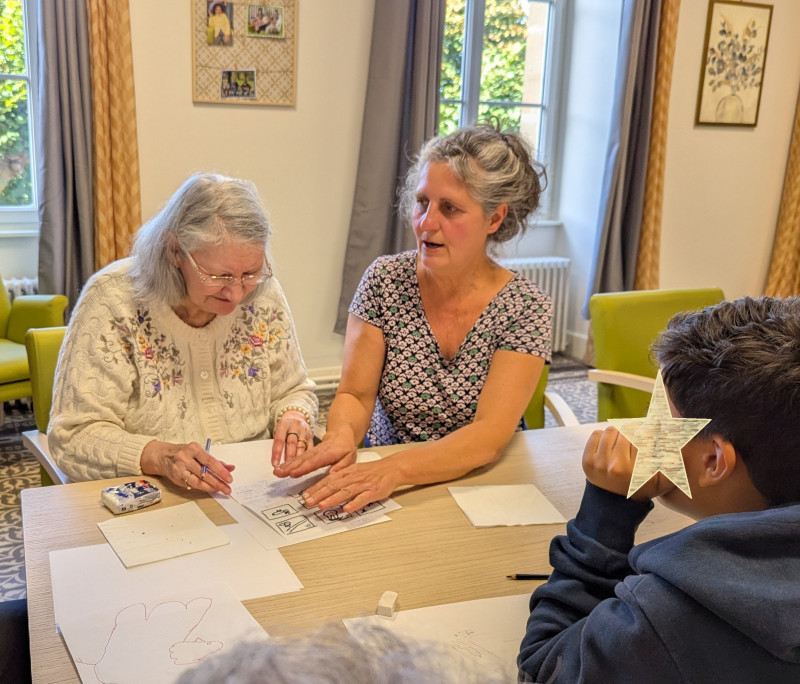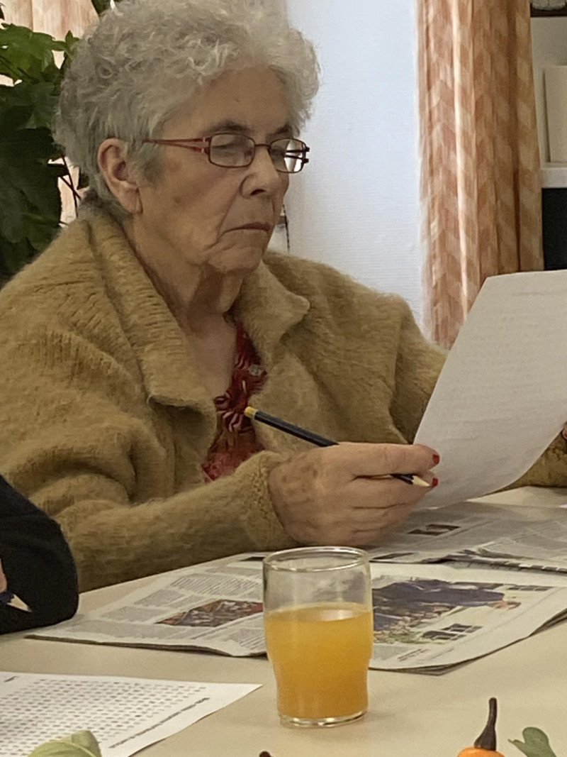 Chacun est concentré sur sa feuille, essayant de bien faire. Ces moments de réflexion et de partage sont toujours très appréciés des résidents, qui participent avec plaisir et motivation.