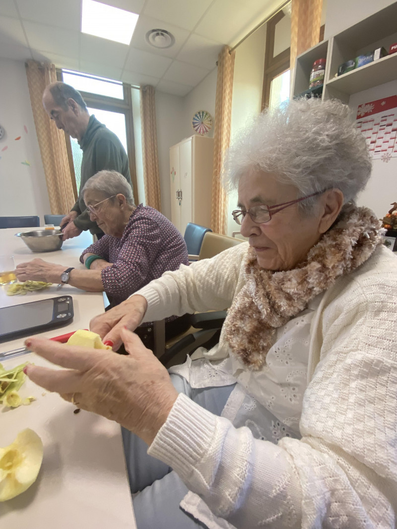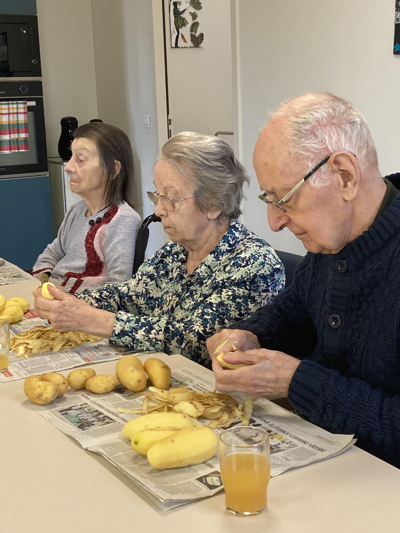 Les résidents sont toujours ravis de partager un moment autour de la table pour aider tout en échangeant. Aujourd’hui, place à l’épluchage des pommes de terre ! Chacun s’est montré appliqué...